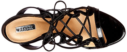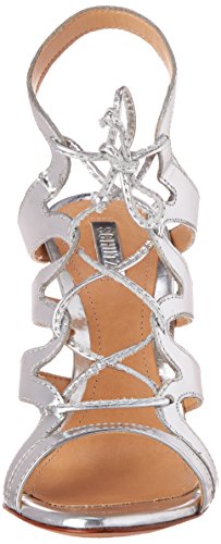 High-gloss sandal featuring stiletto heel and gladiator-inspired lacing at vamp