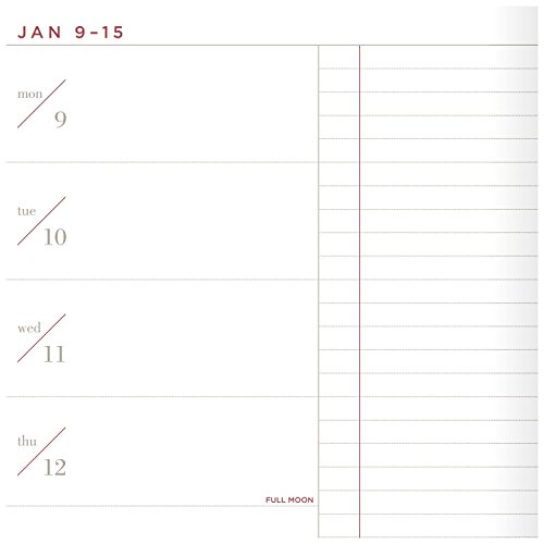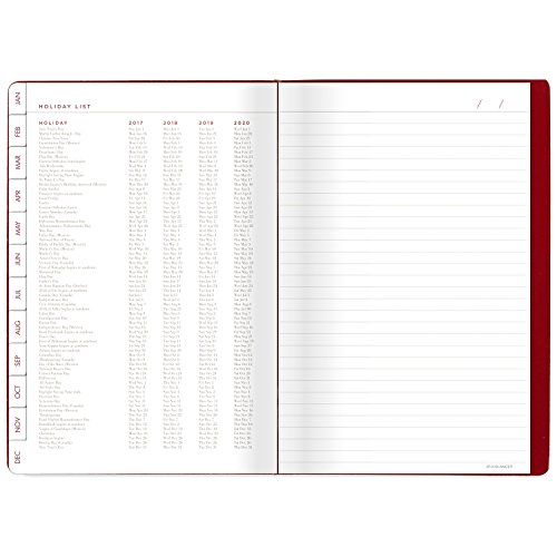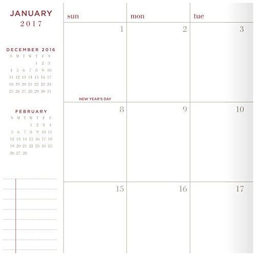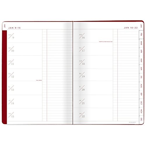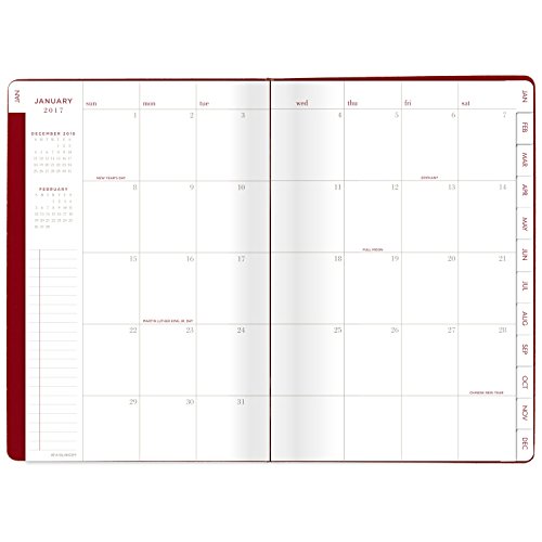 -. Feature : 2017 weekly / monthly planner covers 12 months from January - December; dual format planner has red covers with a textured fabric feel; matching red bungee closure keeps stitch design weekly planner closed on the go; 6 x 8-3/4" page size / Two weeks per two page spread is spacious and makes it easy to organize plans; step-tabbed, one month per two page spread features unruled blocks for making note of events along with past and future months reference / Additional notes space also included on each weekly spread; special pages included: holiday listing, 3 year reference calendars, and notes; P.R.Inted on quality paper containing a minimum of 60% post-consumer waste recycled material