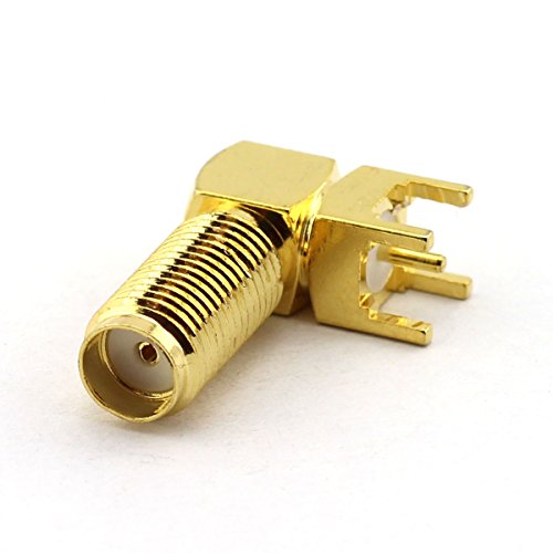 -. Feature : Type: SMA adapter PCB mount plug Right Angle Connector. / Material: Made of high quality pure brass, which has good connectivity. / Function: One side is SMA female with inner bore, and the other side is PCB panel mount plug with 4 pin stand. / Applications: Suitable for Antennas, Broadcast, Radios, Wi-Fi, Telecom, Coaxial cable, LMR, Wireless LAN Devices, CCTV, Microwave Applications and Digital Communication System etc. / Package: 5pcs 19mm SMA Female PCB Panel Mount Right Angle Adapters