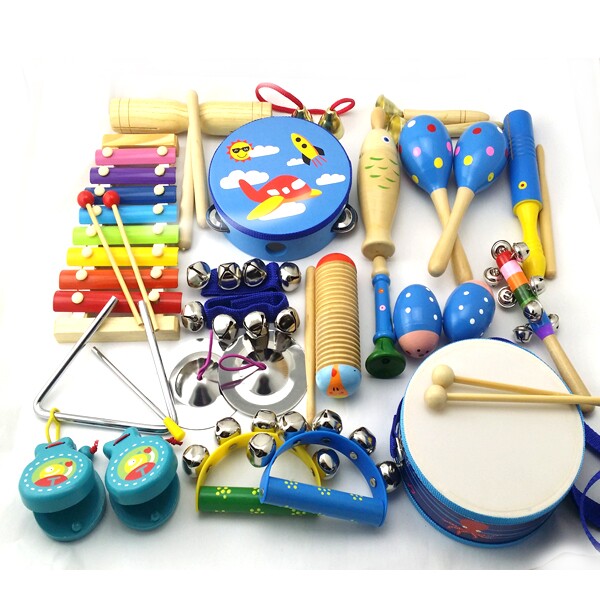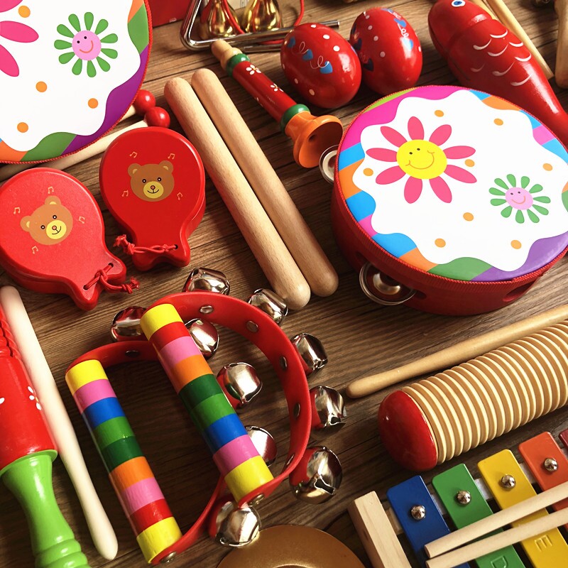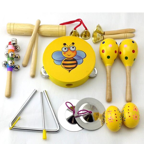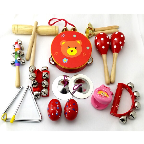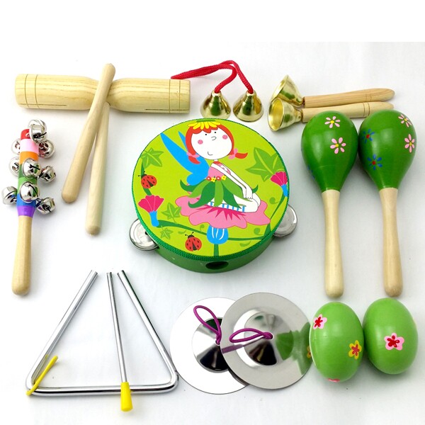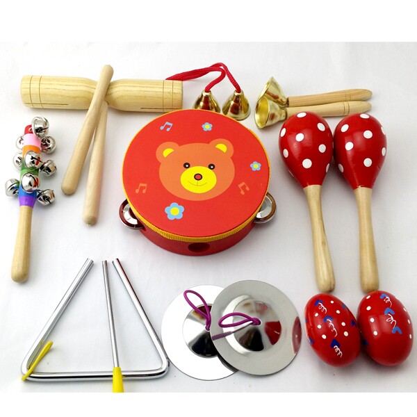 产品名称:11件套:铃鼓1个,沙球2个,木柄碰钟1,双响筒1,沙蛋2,七彩响铃1,三角铁1,铁镲1,穿线碰钟1