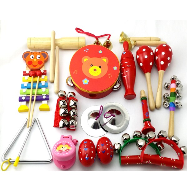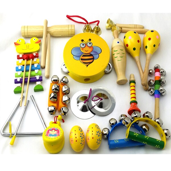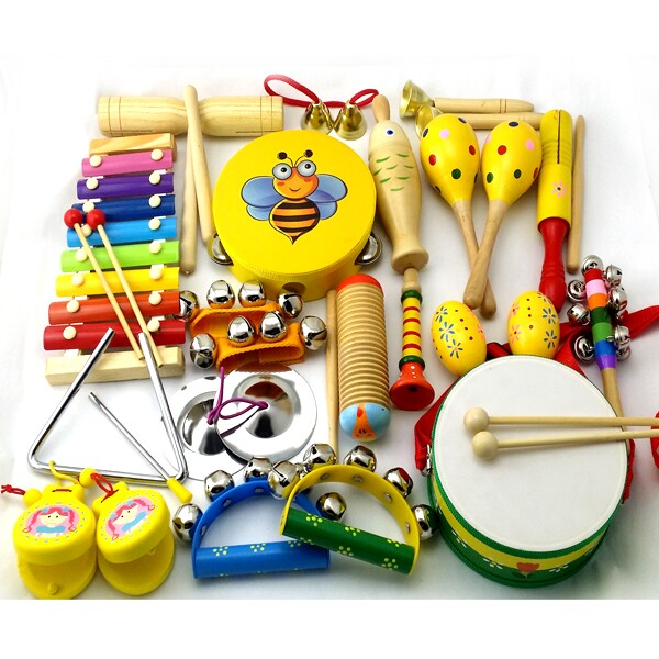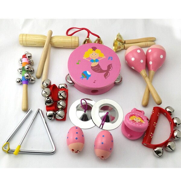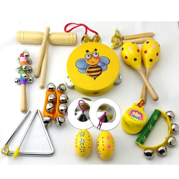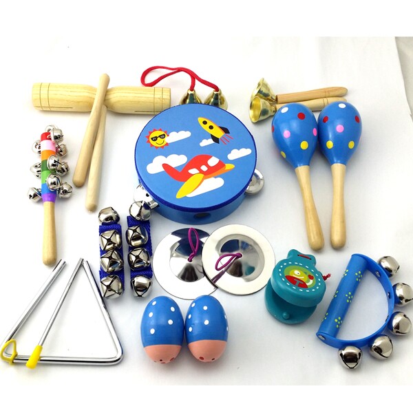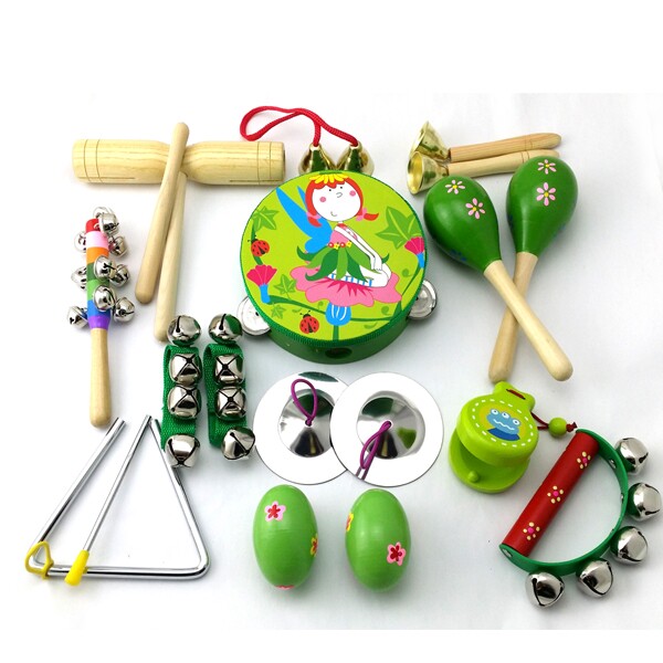 产品名称:15件套:铃鼓1个,沙球2个,木柄碰钟1,双响筒1,沙蛋2,半圆手摇铃1,七彩响铃1,响板1,三角铁1,铁镲1,手腕铃2穿线碰钟1