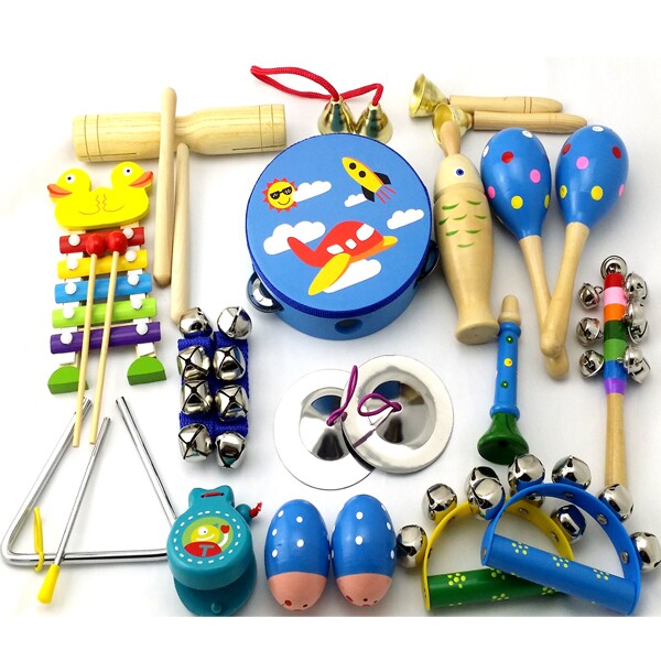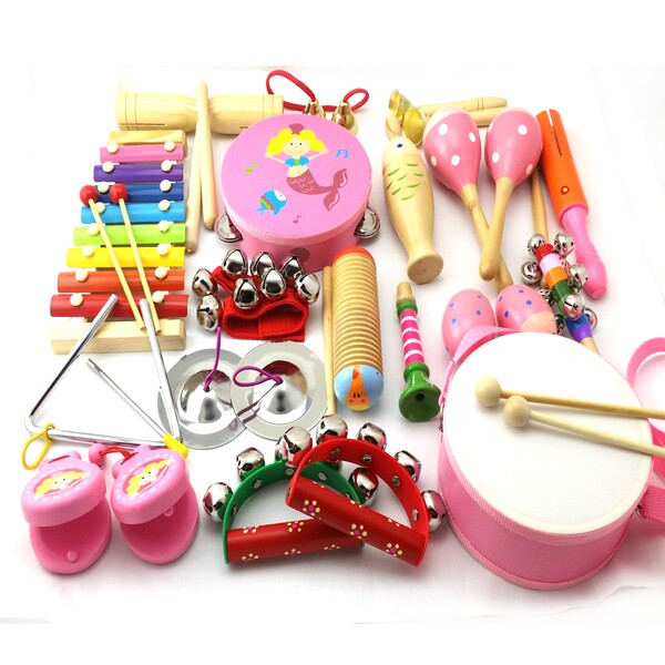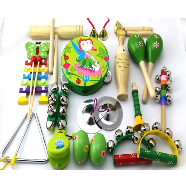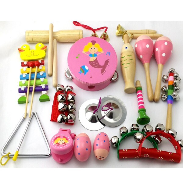 23乐器套装:铃鼓1个,沙球2个,木柄碰钟1,双响筒1,沙蛋2,半圆手摇铃2,七彩响铃1,响板2,手腕铃2