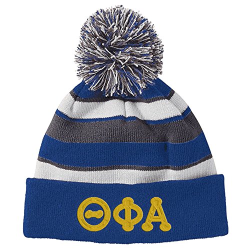 Product DescriptionTheta Phi Alpha Lettered Comeback Beanie Warm and soft 100% acrylic rib knit Tri-color pom-pom detail on top Folded hem Fit type: One size - Great cute Greek font.0