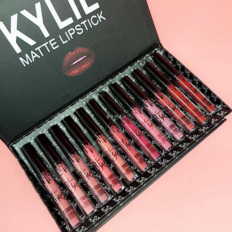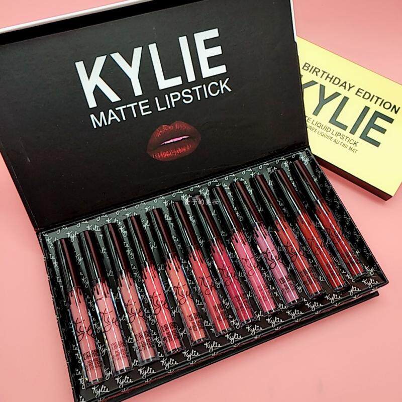 Each kit comes with 12 full size matte liquid lipsticks in Kylie`s favorite shades.