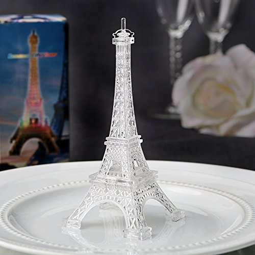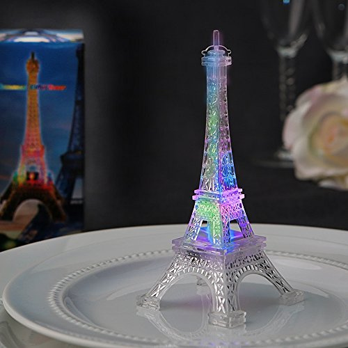 Studio : Fashioncraft Publisher : Fashioncraft Binding : Kitchen Product Description This replica of the iconic Eiffel Tower is highly detailed, and measures 5" high x 2 1/4" square at the base. Battery operated, it has LED lights that constantly change color and intermittently flash. The on-off switch is at the base of the Eiffel Tower. When "off" it's simply a clear replica. Batteries are included and are replaceable. Beautifully boxed in a full color box. Be reminded of Paris every day. Made of lightweight plastic, and highly detailed architecturally. An ideal centerpiece for your next French themed party! 0