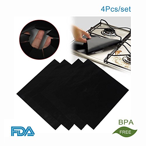 -. Brand : Hoojee -. Color : Black -. EAN : 0715776422245 -. Feature : MATERIAL: Teflon coating glass fiber cloth. / HIGHT QUALITY: Made of the safest material.Have been approved by FDA. / KEEP STOVE CLEAN: For gas stoves, put protectors under burner grate below the flame to keep it clean and protected.It can be trimmed to fit different gas stoves and is Non-stick. / RESISTS HIGH TEMPERATURES: Withstand temperatures up to 260 degrees.Protectors Are Not 100% Fireproof. Avoid Direct Contact With Flame. / FULLY REUSABLE: Easy to clean and wipe down the dirt.Wash with hot soapy water or dishwasher. -. Label : Hoojee -. Manufacturer : Hoojee -. PackageQuantity : 1 -. ProductGroup : Kitchen -. ProductTypeName : KITCHEN -. Publisher : Hoojee -. Studio : Hoojee -. Title : Gas Hob Range Stovetop Burner Protector Liner Cover Non-Stick Kitchen Tools Reusable(Black,10.6"x 10.6",4 Pcs/set) -. UPC : 715776422245