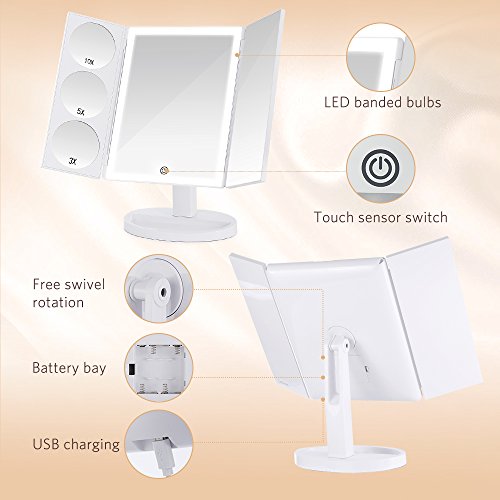 - ·1x, 3x, 5x, 10x Magnify Mirrors and 360° Rotation: The 1x,3x, 5x, 10x magnify mirrors are used for viewing the fine details on your face, allowing you to get a delicate makeup. The makeup mirror standing on your table can be rotated up and down 90° vertical rotation and surround 360° rotation, taking care of every angle on your face and making you feel freely to make up with any position, such as standing, sitting and bowing etc.