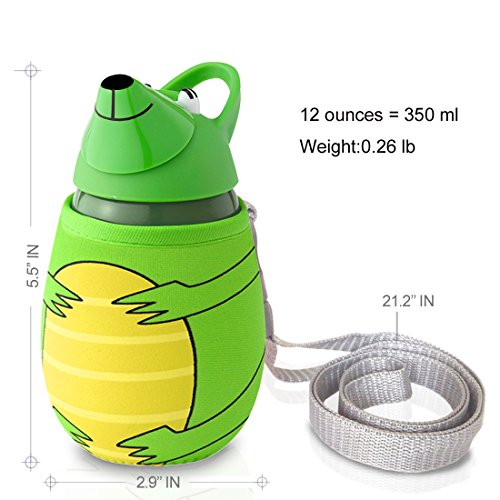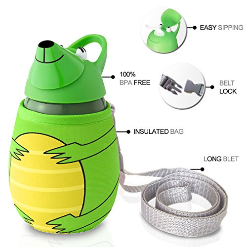- Feature : Great design. The kids water bottle features a spill-resistant design and cute animal graphics to keep the kids happy / 100% BPA FREE, made of high quality, eco-friendly, and shatter-proof Tritan plastic. Safe for the kid and the environment / Convenient carrying strap, making it easy to carry with you anywhere you go, the strap is wide and soft enough to rest softly on the shoulder without digging or chafing / Soft insulating neoprene sleeve, the same material used in wetsuits, keeps the beverages cooler or warmer for longer periods of time and helps protect from small knocks or bumps / Leak proof top lid, when you close the lid, the straw stays hidden inside the water bottles lid, clean from any unwanted dirt they might pick up and no liquid will leak out. Dishwasher-safe