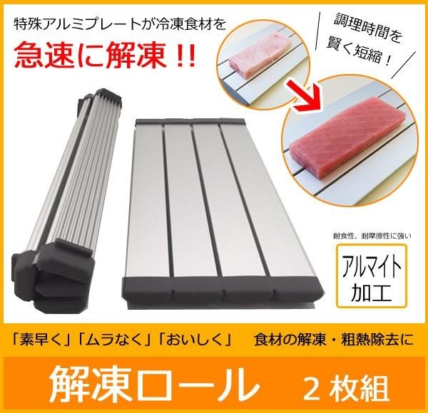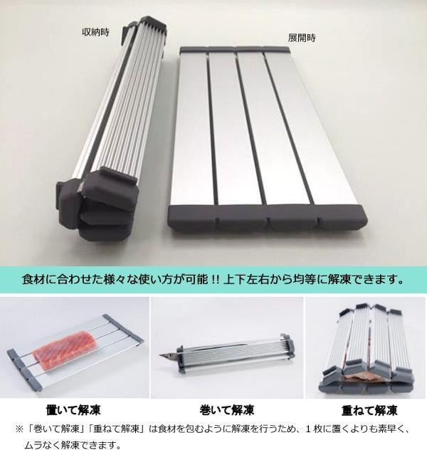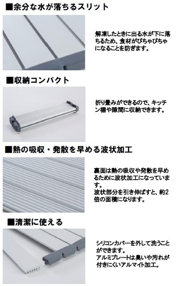 | 温度伝導の高いアルミ製プレートで、自然解凍の約3~5倍の速度で冷凍食材をスピード解凍!!解凍だけでなく、暖かい食材の粗熱除去にもオススメです。 |