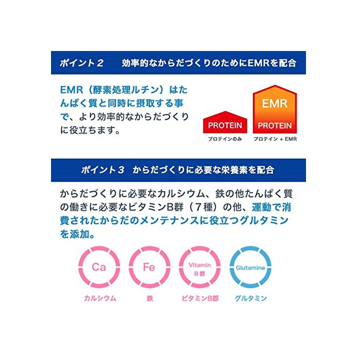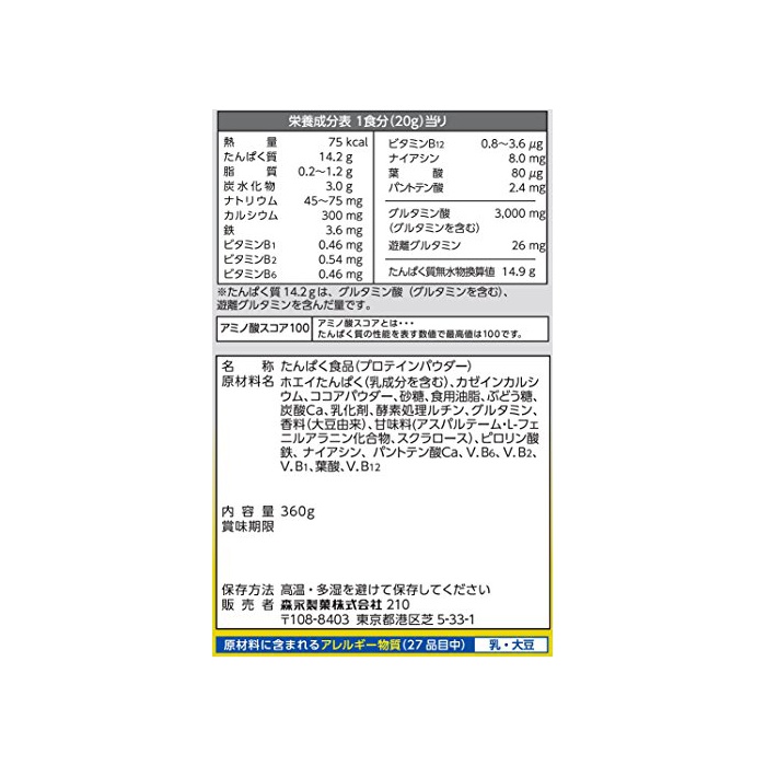 원재료 : 《호에이》담백(유성분을 포함한다)고, (Kasein)카세인 칼슘,코코아 파우더,설탕,식용유지,포도당,탄산Ca,유화 제,효소 처리 루틴,글루타민,향료(대두 유래)고, 감미료(아스 PAL《데무》L-회《니루아라닌》화합물,《스쿠라로스》)고, 《피로린》산철,나이아신,판토텐산Ca,V.B6,V.B2,V.B1,엽산,V.B12