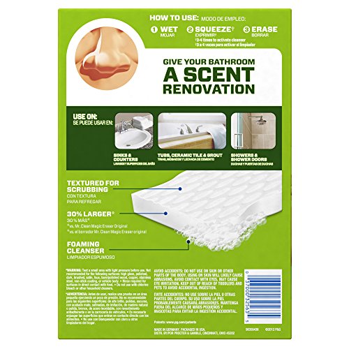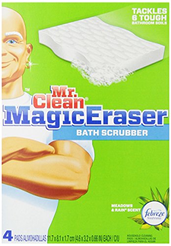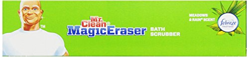 The build-up of tough soap scum on your sink, shower and tub can quickly transform your bathroom from shiny and clean to dingy and grimy. Getting your bathroom hard surfaces sparkling again, however, doesn't mean hours of backbreaking work when you use the soap scum fighting power of Mr. Clean Magic Eraser Bath Scrubber. Mr. Clean Magic Eraser Bath Scrubber cleans more soap scum per swipe. The Eraser pad has a 30% larger and more durable scrubbing surface vs. the Magic Eraser Original. Mr. Clean Magic Eraser Bath Scrubber tackles bathroom build-up easily. vs. the leading all purpose bleach spray cleanerFeature