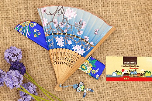 Wise Bird Chinese Fan Japanese Folding Hand Fan, Vintage Retro Style Fan 8" Bamboo/Wood/Sandalwood Fan, Silk Fan Purse Fan, Wedding Favors, Home Decor Fan with Sleeve/Embroidery Tassel - F501 …