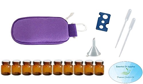 10 Bottle Essential Oil Padded Keychain Carrying Case Travel Bag (Purple), 1ml Euro Orifice Reducer Bottles, Bottle Opener, Funnel, Pipettes