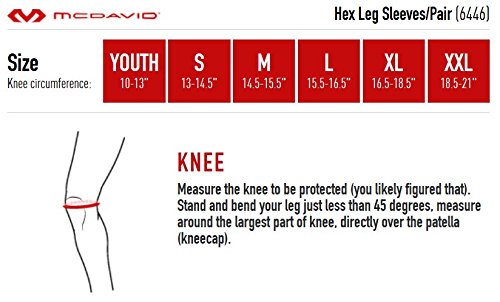 Product Description Leg sleeve featuring 9mm Hex Technology is a favorite among pro and collegiate players. Measurements around knee include, Small (10-12") Medium (12-14") Large (14-16") XL (16-19") 2XL (19-22"). 0