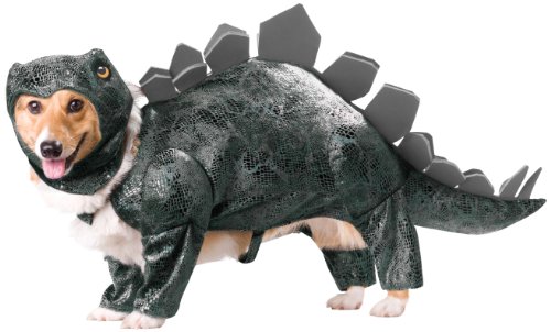 A plated prehistoric pet. Stegosaurus costume includes foam headpiece and padded green jumpsuit with attached spinal plates and tail.