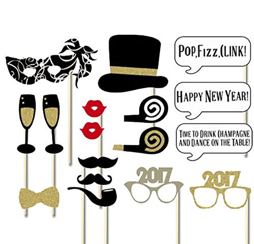 Veewon 2017 New Year Photo Booth Props 18pcs DIY Kit New Years Eve Party Photobooth Prop Card Masks Mustache Hat Red Lips Glasses Decoration