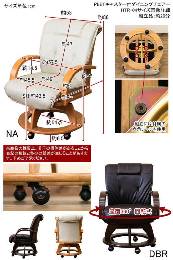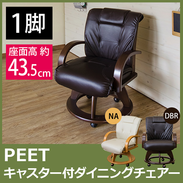 本商品はお取り寄せ商品のため、稀にご注文入れ違い等により欠品・遅延となる場合がございます。誠に恐れ入りますが、何卒ご了承ください。 また、以下の場合には追加送料がかかる場合がございます。  ・大型商品の複数購入時 ・同梱区分が異なる商品の複数購入時  【出荷目安】:1 - 4営業日 ※土日・祝除く 【同梱区分】:TS 1490 【梱包サイズ】:大型商品 【代引き決済】:不可  配送伝票の依頼主は出荷元(メーカーもしくは仕入元)名となる場合がございますので、お受け取りの際はご注意ください。   【型番】htr04  【商品名の色やサイズについて】 こちらは「キャスター付きダイニングチェア/リビングチェア 【1脚】 ナチュラル 『PEET』 肘付き 張り地:合成皮革(合皮)」の商品ページです。商品画像や商品情報には、色違いやサイズ違いの商品が載っている場合がございます。ご注文前に色・サイズ・セット内容のご確認をお願いいたします。  PEET キャスター付きダイニングチェアです ■■ご使用の際の注意点■■フローリング等でご使用の場合、床に傷が付いてしまったり、へこんでしまう恐れがあります。 市販のシートやマットと併せてご使用頂くことをお勧めします。 座面は360度回転します 張り材はお手入れし易いPVCです 厚めなクッションでふっくらしてます 足元は円形ベースにキャスター付きです  ダークブラウン(DBR)、ナチュラル(NA)の2色展開です  ※組み立ての際の注意点※ ボルトは座面裏に取り付いた状態で届きます 付属の工具で外していただいてから組み立てて下さい  幅575×奥行700×高さ860mm(梱包サイズ:幅580×奥行710×高さ580mm) 座面高:約435mm 座面厚:約100mm 本体重量:14.9kg(梱包重量:17.6kg) 組立式(約20分/付属の六角レンチにて組立)1梱包 フレーム:天然木ラバーウッド(アミノアルキド樹脂塗装) 張り材:合成皮革(PVC) 中材:ウレタンフォーム キャスター5個付き  原産国:タイ  【ご注意事項】 ※本商品は、北海道・沖縄・離島への配送はいたしかねます。あらかじめご了承ください。