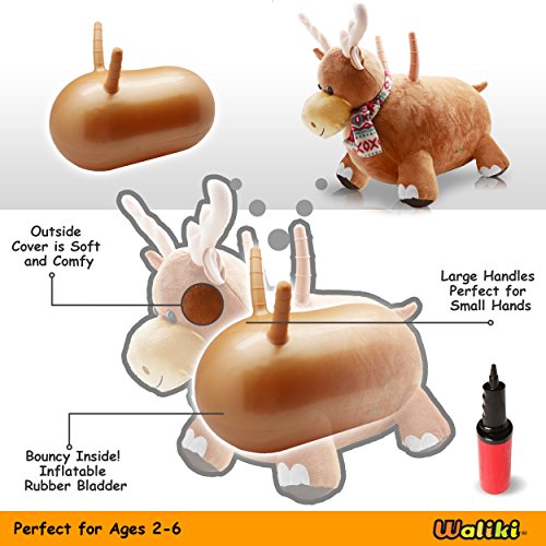 Studio : WALIKI Publisher : WALIKI Binding : Toy Product Description Get exercise, build balance, and keep your kids active with their new best friend: ?The Reindeer Bouncy Horse It's a horse hopper style inflated ride-on animal. Children and toddlers love the soft cuddly plush cover, and quickly learn to sit and bounce forward while developing balance and coordination. Parents enjoy the convenient hand pump included, and relaxing while their little cowboys and cowgirls burn off extra energy bouncing around. Our colorful and inflatable Jumping Horse is stable, thick, and durable but soft and light weight. It will look great in any playroom. Not just for fun The Bouncy Reindeer and WALIKI's full line of Hopping Horses are used in kindergartens and schools as a fine-motor tool. Our Hopper Horse features two comfortable handles and soft legs that help it stay in place. Therapists employ it to stimulate creativity, movement and to improve motor skills. But we created this Reindeer with FUN in mind, just like a real riding horse for kids should be. Child's room ?Waliki's Plush Cover Bouncy Horses feature 4 soft legs allowing it to stand on it's own. It's colorful and beautiful, adding an extra touch to your child's room. Our bouncy toys are designed with love in Miami, Florida, and made with care in PRC. The plug is a small part so children under 3 should have adult supervision. Keep your Children happy and entertained with our line of plush covered bouncy toys! Waliki Toys Based in Florida and was created thanks to a generous and beautiful grandmother. Her grandson grew up to became a toy expert and started the company. Our goal is to keep children happy, busy and healthy by making exercise fun. We carry a huge range of ride on bouncy toys, bounce houses, and are proud resellers of Rody Horse, which is made by Gymnic. See our other products on sale. 0