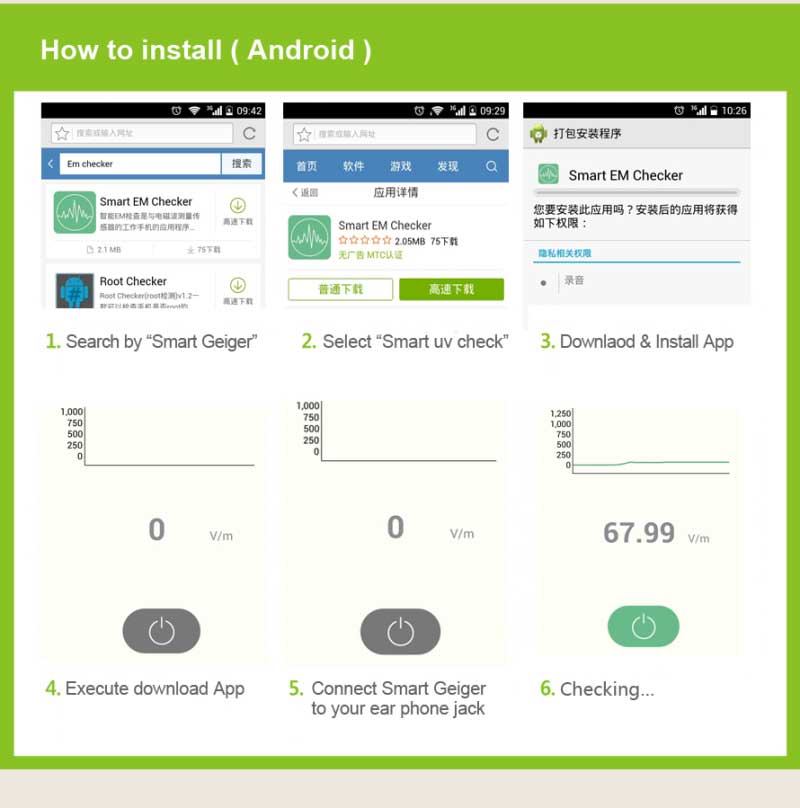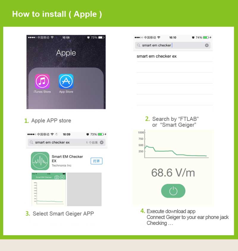 -Search by " FTLAB" or " Smart EM Checker" in the Google play or Apple store to download and install the APP.