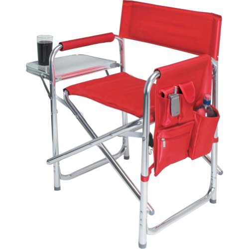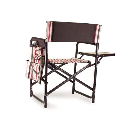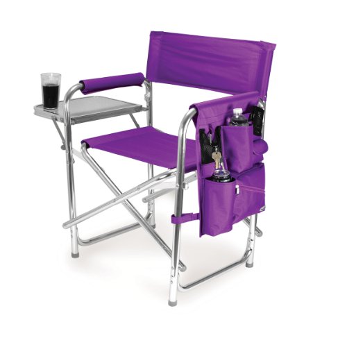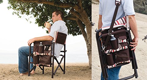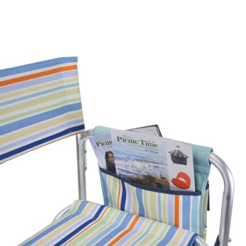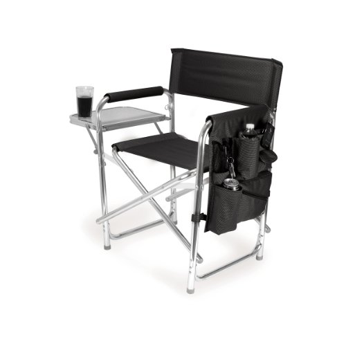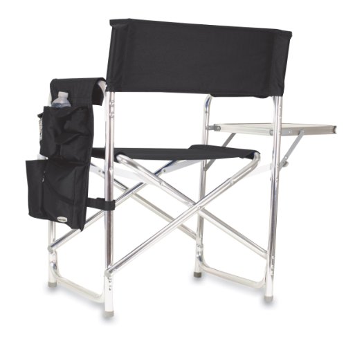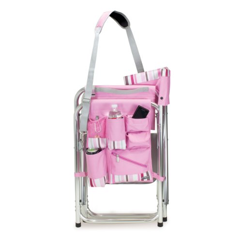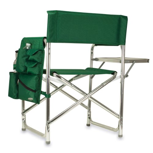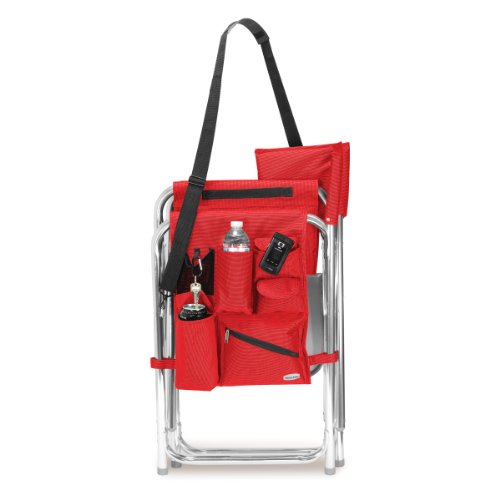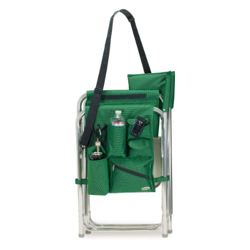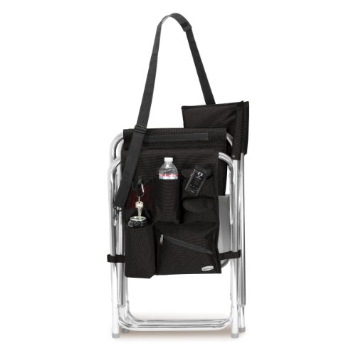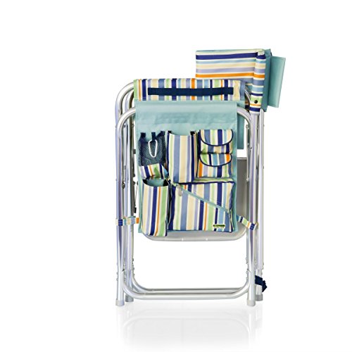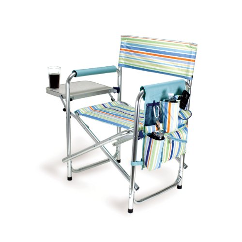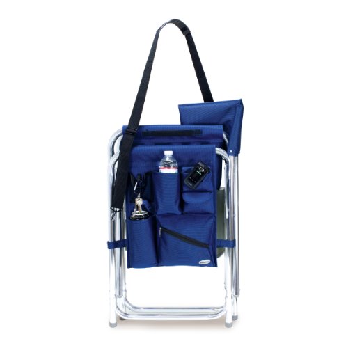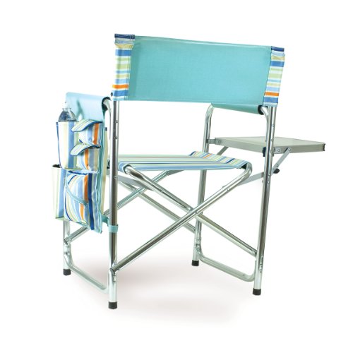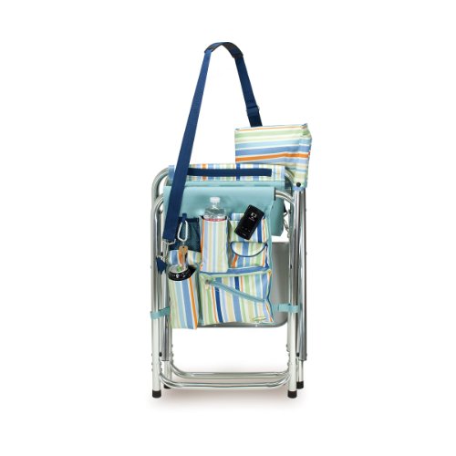 Studio : Picnic Time Publisher : Picnic Time Binding : Lawn Patio Product Description This aqua blue Sports Chair by Picnic Time is the ultimate spectator chair. It's a lightweight, portable folding chair with a sturdy aluminum frame that has an adjustable shoulder strap for easy carrying. If you prefer not to use the shoulder strap, the chair also has two sturdy webbing handles that come into view when the chair is folded. The extra-wide seat is 19-1/2 inches, and is made of durable 600D polyester with padding for extra comfort, while the armrests padded as well, for optimal relaxation. On the side of the chair is an accessories panel that includes a variety of pockets to hold such items as your cell phone, sunglasses, magazines, or a scorekeeper's pad. It also includes an insulated bottled beverage pouch and a zippered security pocket to keep valuables out of plain view. A convenient side table folds out and will hold up to ten pounds of weight, making it perfect for holding food or drinks. The Picnic Time Sports Chair makes a perfect gift for those who enjoy spectator sports, RV-ing, and camping. Maximum weight capacity for the chair is 300 lbs. 0
