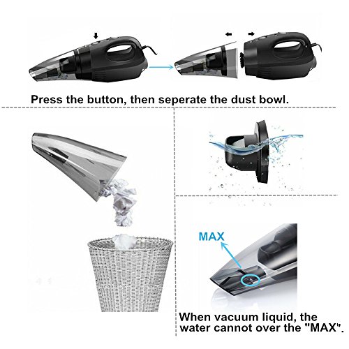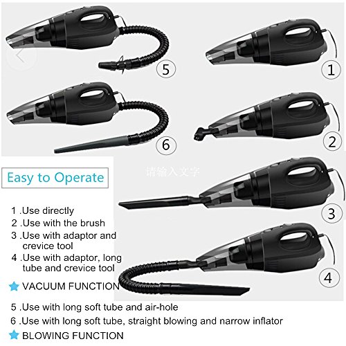 -. Feature : POWERFUL SUCTION AND DEEP ClEAN:120W, DC 12V, 72db low noise. / MULTIFUNCTIONAL CAR VACUUM: Suck up dust and blowing function. / WASHABLE& REMOVABLE HEPA FILTER: Non-woven HEPA FILTER. / EASY TO OPERATE: Comfortable large but lighter vacuum, esay to operate and wash. / GREAT CUSTOMER SERVICE: Backed by 60-day money-back and 18-month worry-free warranty.