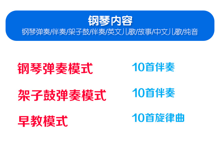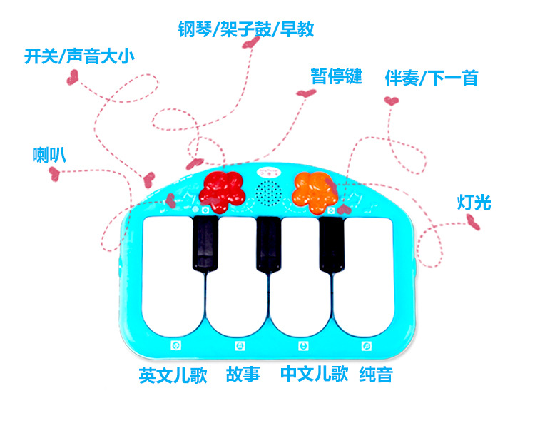 u0026nbsp;3 带早教功能,有音乐有灯光(钢琴模式/架子鼓模式/早教模式u0026lt;英文歌曲、故事、儿歌、旋律乐曲u0026gt;)