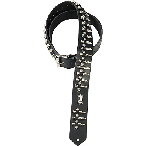 Product Description2" leather guitar strap with metal 1 1/2" fake bullets. Adjusts from 49" to 59".0