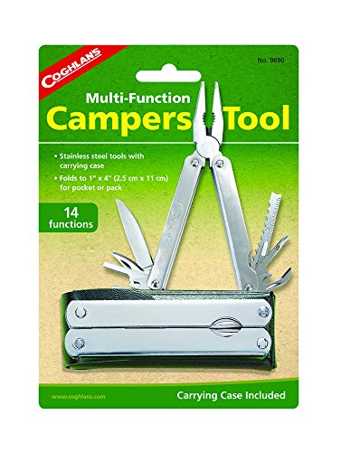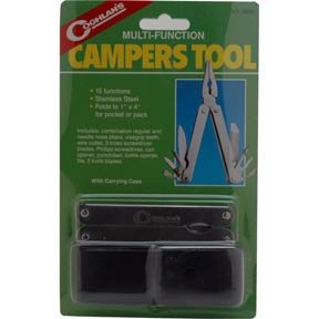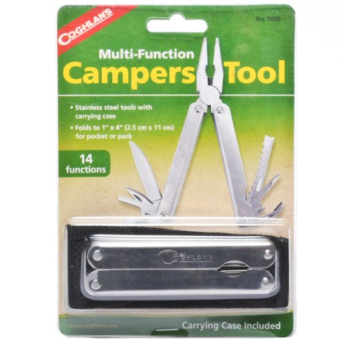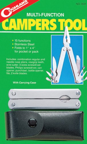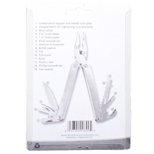 Studio : Coghlan's Publisher : Coghlan's Binding : Automotive Product Description Includes combination regular and needle nose pliers, vise grip teeth, wire cutter, 3 sizes screwdriver blades, Philips screwdriver, can opener, punch/awl, bottle opener, file and two knife blades with carrying case. Stainless steel. Folds to 1 x 4" (2.5 x 11 cm) 0