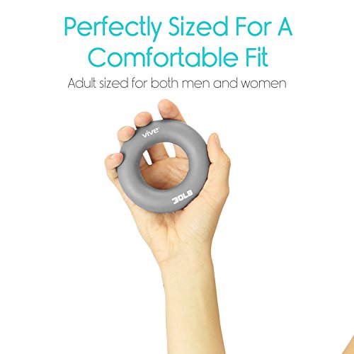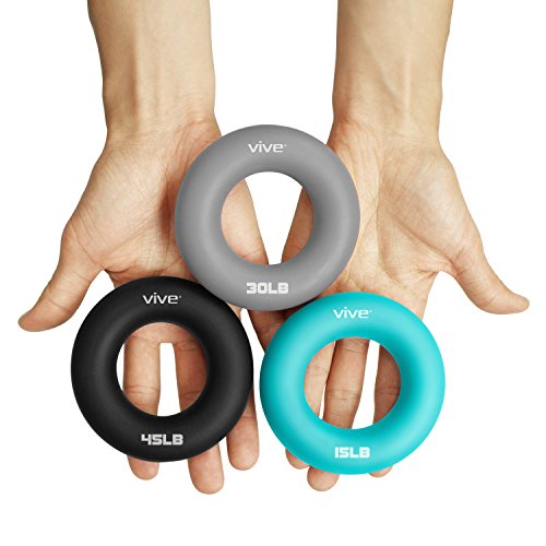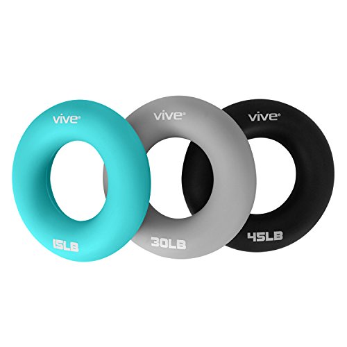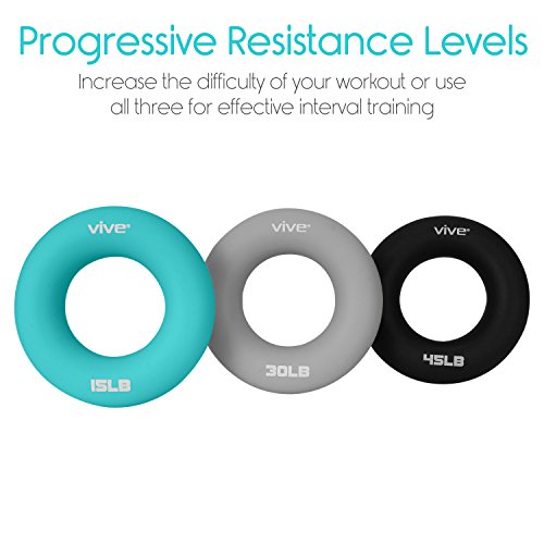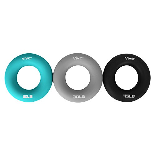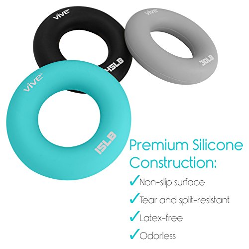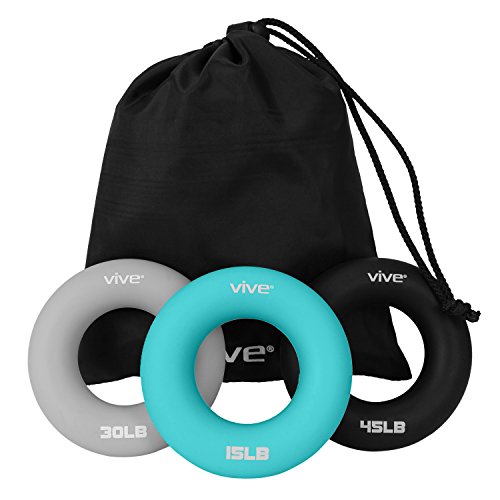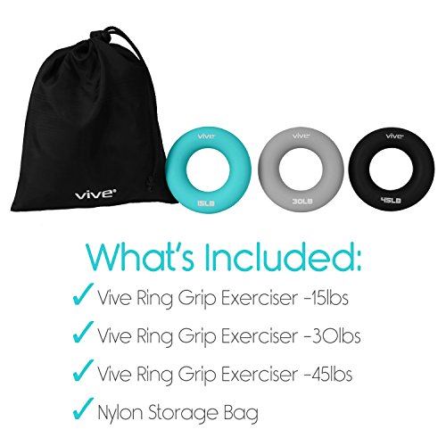 Increase strength and improve dexterity with the Vive hand strengthener rings. Premium silicone rings offer three levels of resistance for gaining strength in the hands, wrists and forearms. The Vive hand strengthener rings are tear-resistant, quiet and odorless and are easily portable in the convenient nylon travel bag. Use to build strength following surgery, as a part of physical therapy or to improve as an athlete or musician. Product Features: - Durable Construction, premium silicone rings are odorless and tear resistant