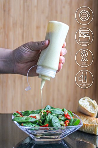 - EASY POURING: The Tovla gourmet condiment bottles have a wide neck so you can easily pour your favorite condiments and dressings. Their tight-fitting attached cap closure prevents spillages and leaking, helping you avoid unpleasant accidents.