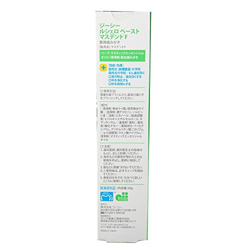 Studio : GC Publisher : GC Binding : Health and Beauty Product Description 【Ingredients】 ●cleaning agent: anhydrous silicic acid, light anhydrous silicic acid ●humectant: concentrated glycerin, sorbitol solution ●solvent: ethanol ●viscosity modifiers: hydroxyethyl cellulose, xanthan gum ●flavoring agent: flavor ●coloring agent: titanium oxide ●medicated ingredients: sodium fluoride, glycyrrhizin dipotassium ●acidity regulator: sodium citrate ●cleaning agent: mastic essential oil 【efficacy】 prevent periodontitis prevent gingivitis prevent tooth decay prevent bad breath whiten your teeth clean your mouth bring about refreshing feeling 【content】 60g 0