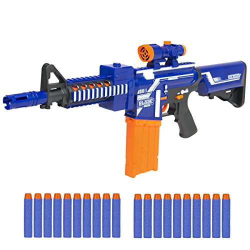 -. Feature : EPIC FIGHTS: This blaster toy gun is constructed of non-toxic ABS plastic in fun, bright colors with soft darts for safe play / REALISTIC DESIGN: Semi-automatic features a full gear frame consisting of a load cartridge, removable sight attachment, power stitch, and trigger / FUN NEVER STOPS: Win battles against friends and family with the long-distance range and quick chamber switch function / LOCKED N' LOADED: Set includes 20 soft darts while the cartridge loads up to 12 darts per round (Compatible with soft darts from most major brands) / ASTM-Certified; Recommended for children ages 6 and up; Dimension: 28"(L) x 2.25"(W) x 12"(H)