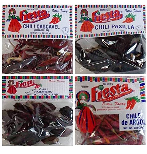 Bolner's Fiesta Extra Fancy Dried Chili Pods 4 Flavor Variety Bundle: (1) Cascavel (Guajillo) Chili Pods, (1) Habanero (Very Hot!) Chili Pods, (1) Pasilla Chili Pods, and (1) Chile de Arbol Chili Pods, .5-1.5 Oz. Ea.