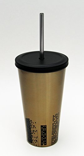 A stainless steel cold cup with stainless steel straw. Gold tone. Adding to the luster is a reusable stainless steel straw with a ridged bottom to help keep it in place. The cold cup's double wall construction helps keep your iced tea and coffee beverages cold longer while decreasing condensation. Embossed Siren logo. Holds up to 16 fl oz. Hand wash only. Do not microwave.