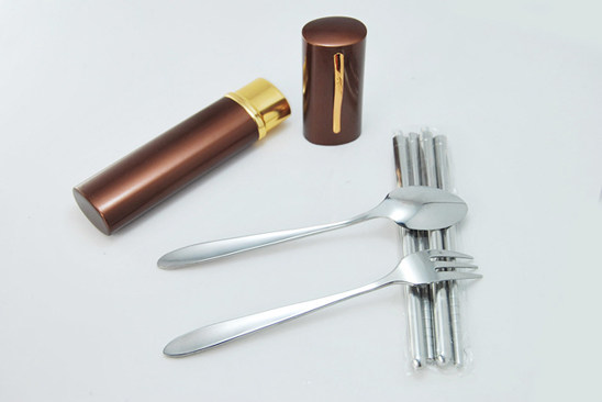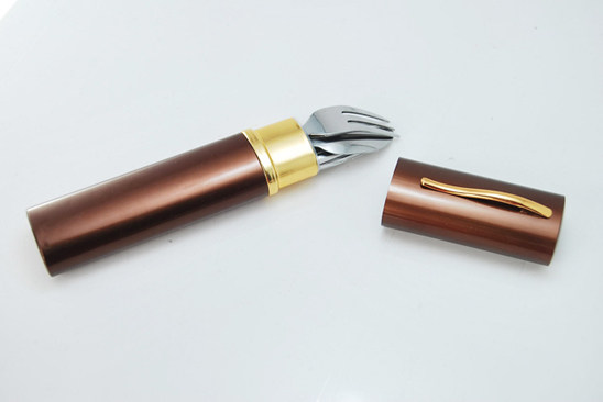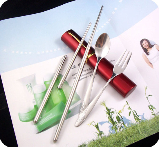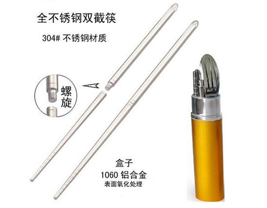 【品 名】:新款笔筒式不锈钢餐具三件套【材 料】:不绣钢(筷子接口为铝)【形 状】:笔筒型【尺 寸】:盒子长14.2CM