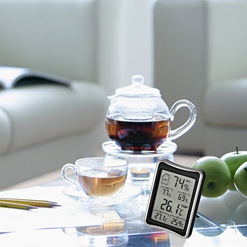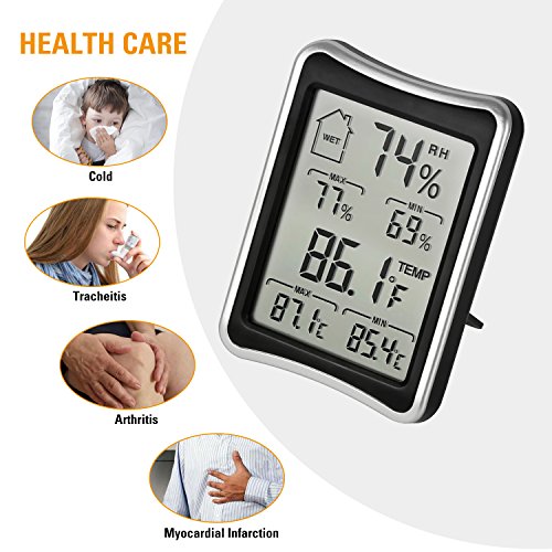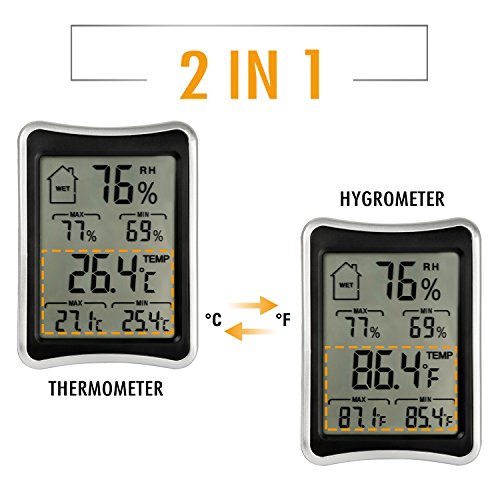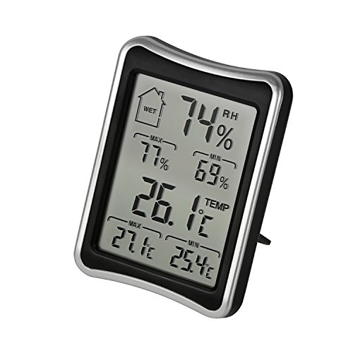 Digital thermometer hygrometer displays current temperature & humidity records. Auto records max and min humidity and temperature.