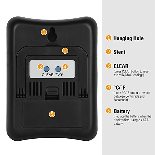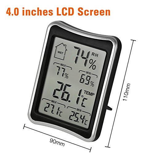4.0 inches super large LCD display screen shows instant and current temperature (Fahrenheit or Celsius) and humidity.