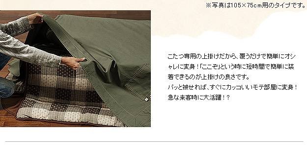 ※メーカー直送のため代金引換はお受けできません。※沖縄・一部離島は別途送料がかかります。お見積もりいたしますのでお問い合わせ下さい。商品について:【!省スペースこたつ布団専用です!】SIKAKと別注コラボした他にはないミリタリー調の上掛けです。洗いをかけた素材感がお洒落。生地の風合いやアクセントのポケット、タグ、ハトメなど細部にもこだわってちょっぴりハードに仕上げました。こたつ布団の汚れ防止や、お部屋のイメージチェンジにも上掛けを掛けるだけの手軽さです。お洗濯できるので清潔にお使いいただけます。オススメこたつサイズ:75x75cmサイズ(cm):幅185x奥行185cmカラー:デニム・サンドベージュ・アーミーグリーン材質:生地-綿100%完成品(32800005)