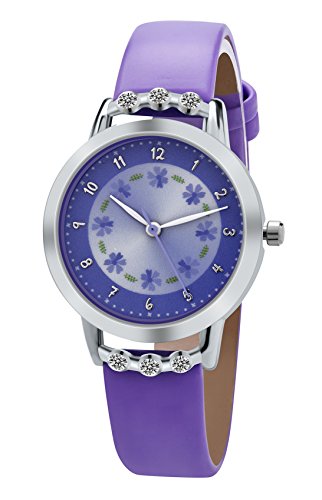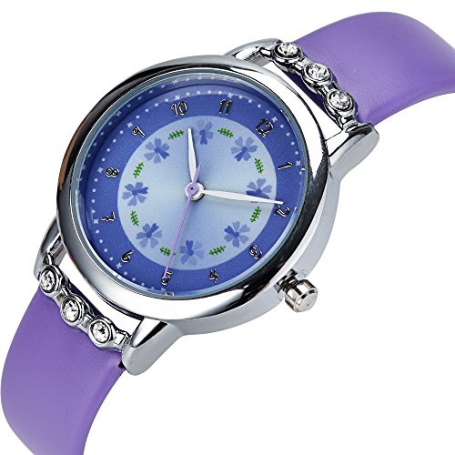 Dovoda Kids Watch Girl Watches Easy Reader Time Teacher Flowers Diamond Purple Leather Band