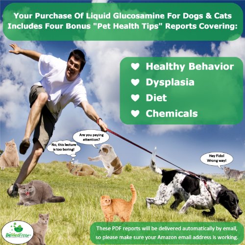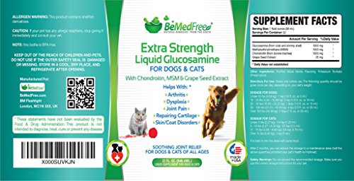 -. Feature : CHONDROITIN, GLUCOSAMINE AND MSM IS A VET-RECOMMENDED combination cat & dog joint supplement that's great for joint pain, feline / canine arthritis, inflammation, elbow & hip dysplasia, dry or itchy skin, coat health, as well as cartilage repair and growth, and it's also a great collagen builder. / EXTRA STRENGTH LIQUID GLUCOSAMINE FOR DOGS & CATS from BeMedFree contains more Glucosamine (1,500 mg per fl. oz.), Chondroitin (1,200 mg per fl. oz.) and MSM (1,500 mg per fl. oz.) than many brands. The advantage is, BeMedFree's proP.R.Ietary formulation (which is made to our specifications by a company with a 90+ year history of creating unique natural health products) will last longer, saving you money in the long term. / IT'S GREAT FOR ANIMALS of all ages, from pups / kittens and small dogs / cats through to large and senior pets, and it's easy to administer - simply add the liquid to his food. And being a liquid, it's absorbed more easily than tablets, which means you'll see results a lot faster too. / IT ALSO CONTAINS 25MG OF GRAPE SEED EXTRACT (a powerful natural antioxidant) per fl. oz, as well as a pleasant vanilla flavor. (While the flesh of grapes is toxic to dogs and cats, grape seed extract is not only harmless but beneficial too.) What's missing is corn, HFCS, wheat, rice, oats, yeast, egg, soy, starch, gluten, lactose, dairy, sugar, nuts, artificial color, binders, flow agents, fillers, GMOs, sodium benzoate, or gums. And it's made in a federally-regulated facility in North America. / A SUPER STRONG IMMUNE SYSTEM BOOSTER that can help eliminate allergies, infections, and skin diseases, plus, it provides complete all-round dog & cat health care, and will start your puppy / kitten off the right way for a problem-free, active life.