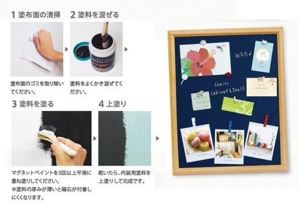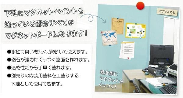 塗布した部分が全てマグネットボードになる下地用塗料。速乾性なので手早く塗れ、また水性なので臭いも無く安心です。