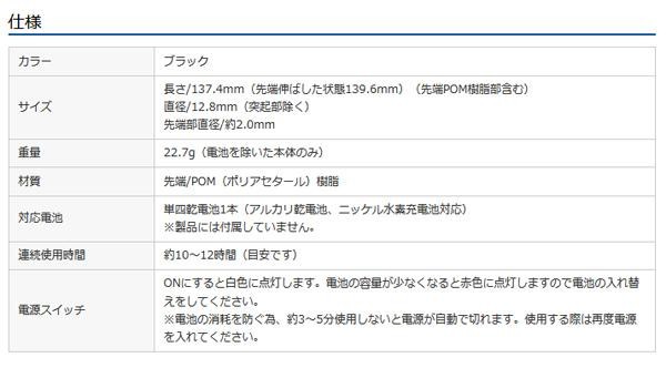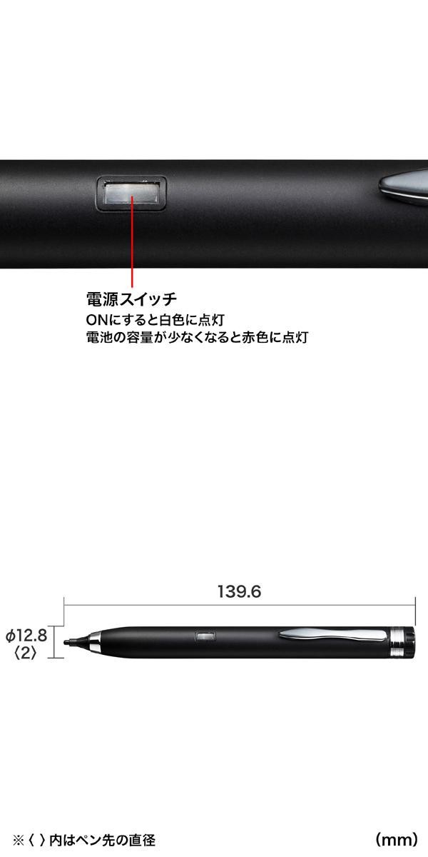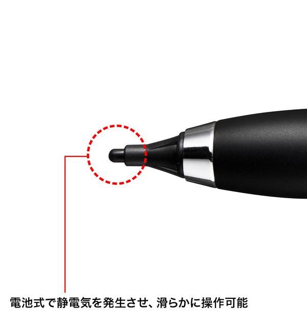 単四乾電池1本を使用して、静電気を発生させる極細タッチペンです(電池は付属しておりません)。先端直径約2.0mmで、ペン先に操作性、耐久性に優れたPOM樹脂素材を使用しています。