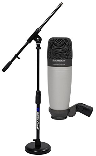 -. Feature : Samson C01 Studio Condenser Recording Microphone Mic with Large diaphragm. Cardioid pickup pattern. Large, dual-layer 19mm diaphragm. Heavy gauge mesh grill. / Gold-plated XLR connector. LED indicates 48V phantom power. Smooth, flat frequency response. Swivel stand mount. Optional SP01 Spider Shockmount. / Rockville Kick Drum/Guitar Amp Mic Stand With Steel Round Base, Fixed Boom and Rubber Pad. Low profile height adjustable microphone stand for kick drums and guitar amps. / Heavy-duty steel round base with rubber pad provide extreme stability. Fixed boom arm provides precise positioning. Scratch-resistant powder coated finish. / Booming length : 20" (50cm). Height adjustment : 18"-28" (45cm-70cm). Base Diameter : 9.8" (25cm). Thread Size : 5/8". Weight : 6.6 lbs (3 kgs)