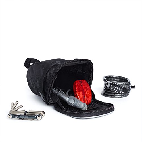 Holds several essentials like a phone, wallet, small bike pump, spare tube, cable lock, and L-wrench set (not included)
