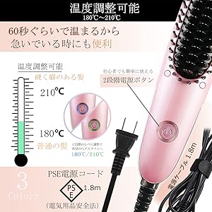 温度調整可能で効率よく美しい ストレートヘアへ - このストレートブラシ ミニ の電源コードは1.8mの長さで使いやすさも抜群です。髪質に合わせて180℃/210℃の2段階の温度調整が可能。温度表示はLEDライト表示なので一目瞭然。ヘアサロンに行く時間や手間をはぶき、強い髪のくせを簡単にまっすぐにし、プロ級のヘアスタイルを長時間キープしてくれます。