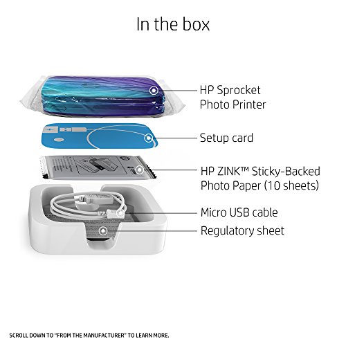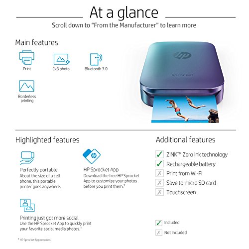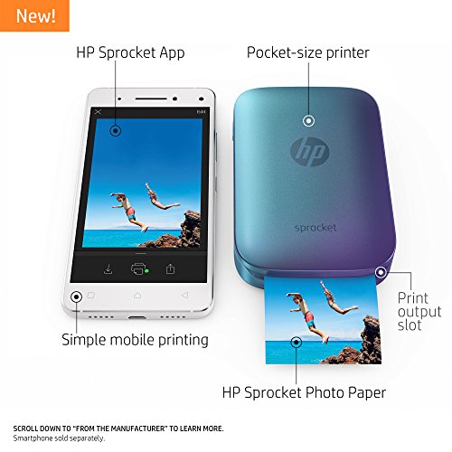 With the portable, lightweight HP Sprocket Photo Printer, print photos from your smartphone or tablet just as easily as you post them. Make time spent with friends more memorable with instantly sharable 2x3-inch snapshots of every fun-filled moment. Use the free HP Sprocket App to customize photos with filters, borders, and emojis, scan printed photos, and view photo collections. Includes 10 sheets of HP ZINK 2x3-inch photo paper with peel-and-stick backing for instant photos or stickers.