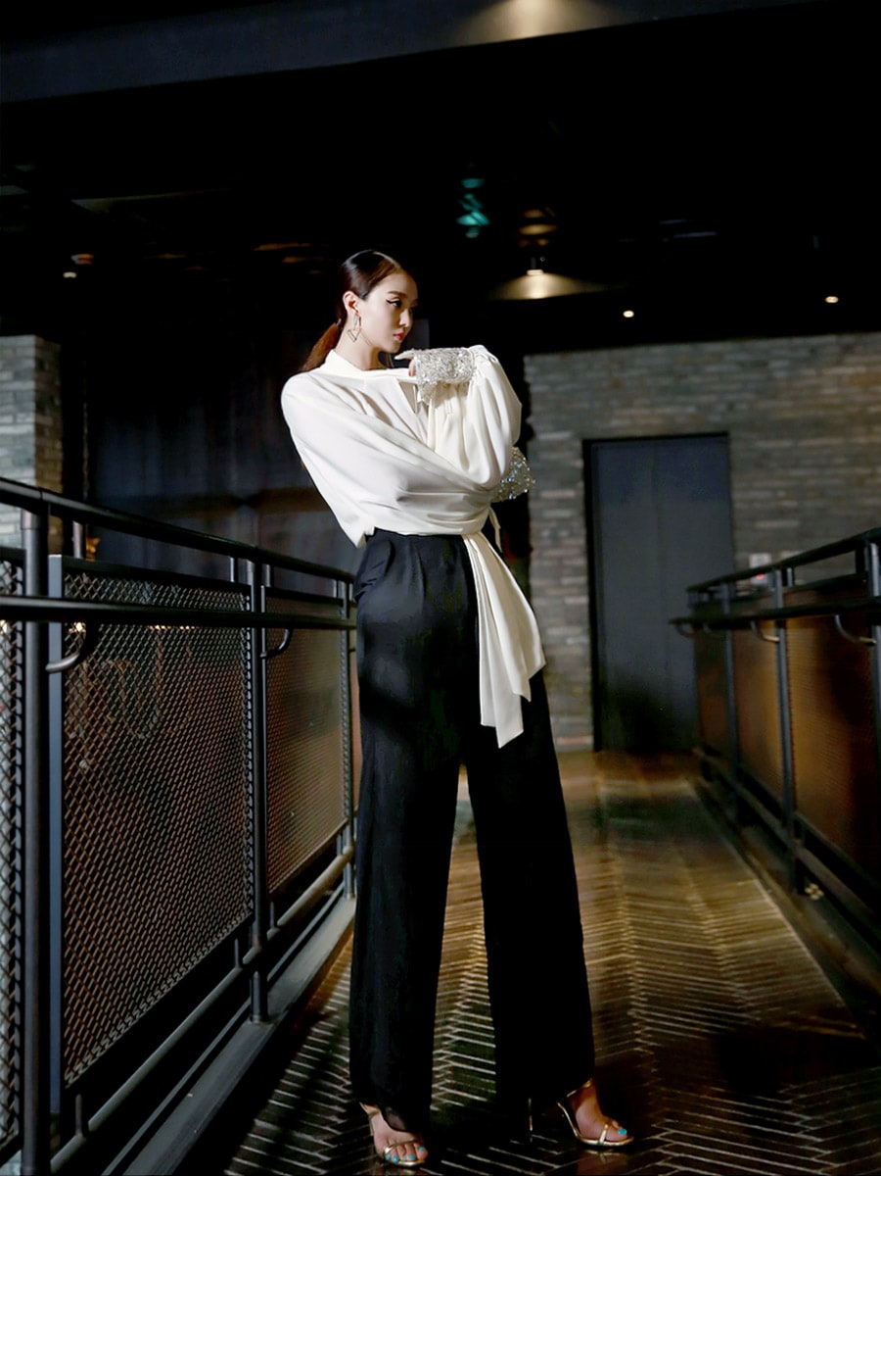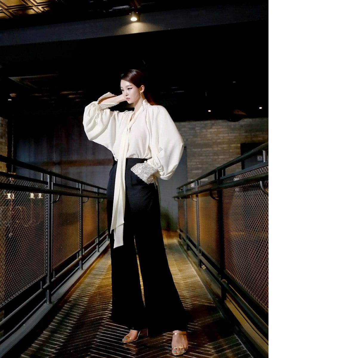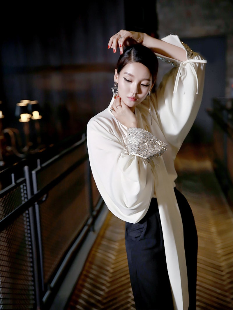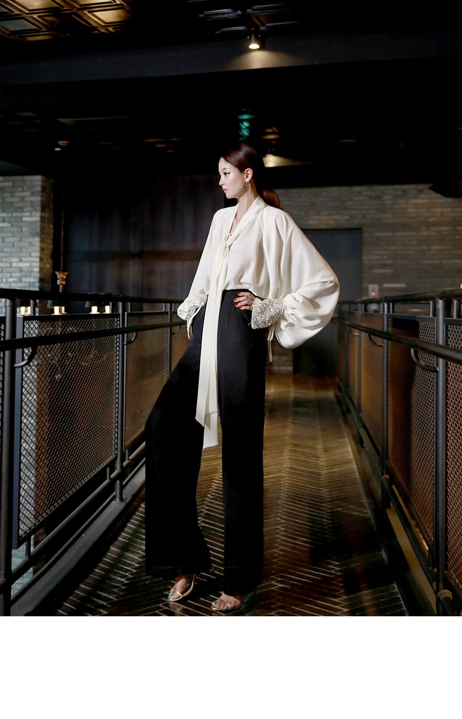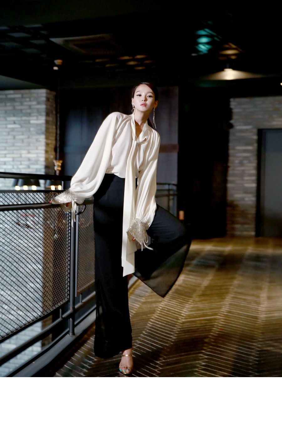 B1909 스팽글 커프스 루즈 블라우스 CreamP1735 스테이 사이드슬릿 쉬폰 슬랙스 BlackAJ-3526 이어링 SilverAJ-3179 링 SilverHAR-594 샤인 스트랩*HAND MADE* Gold
