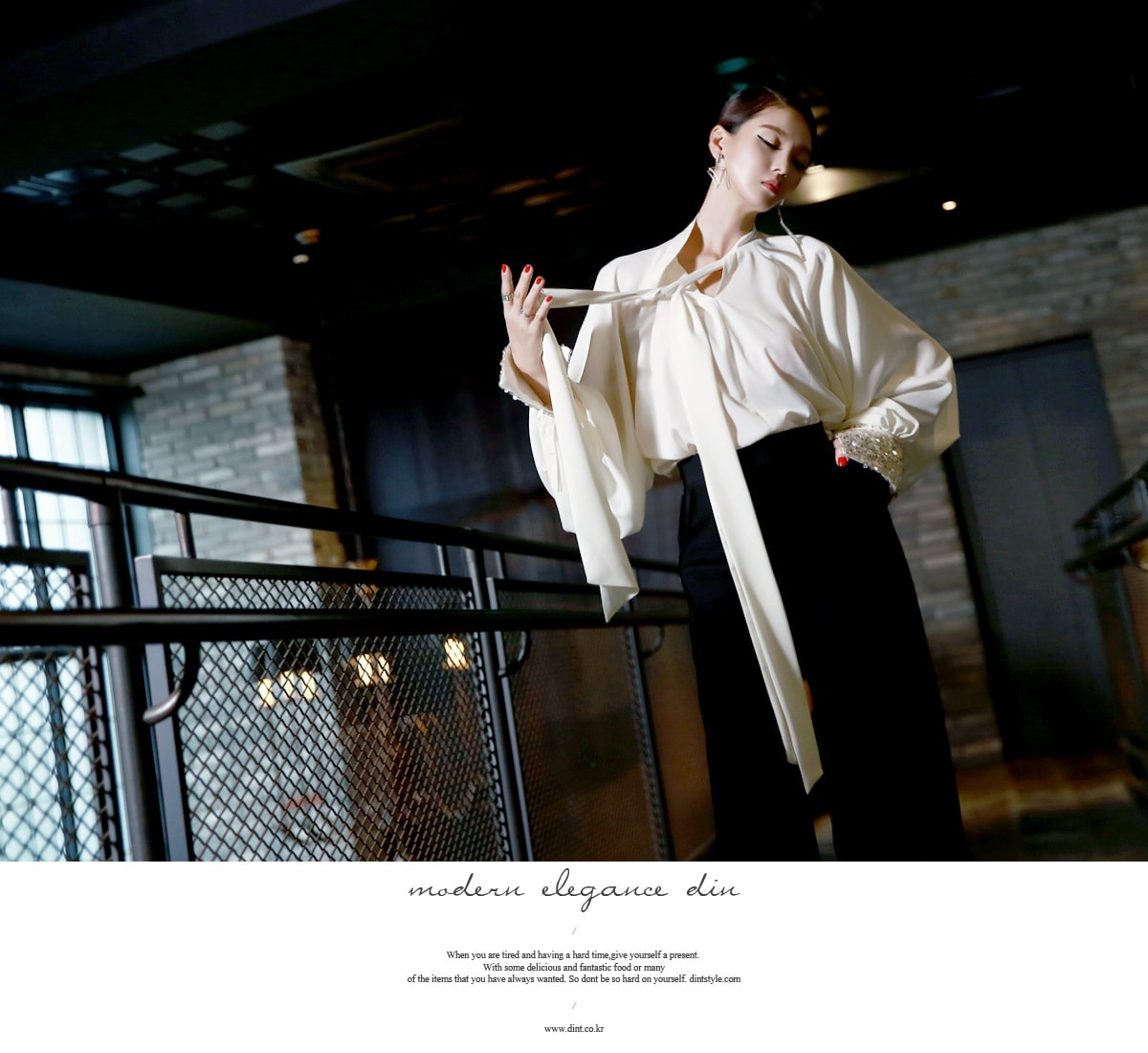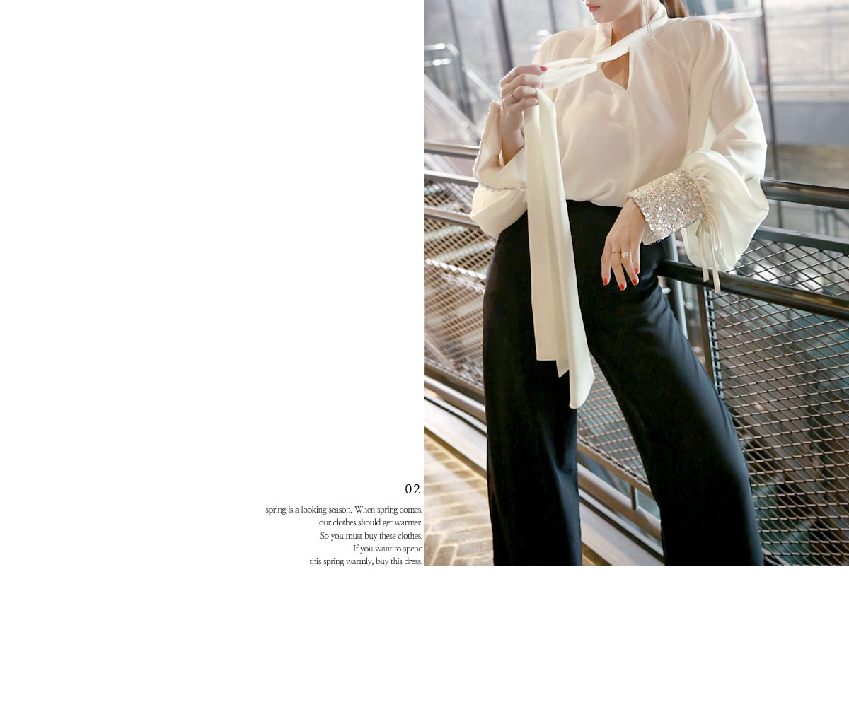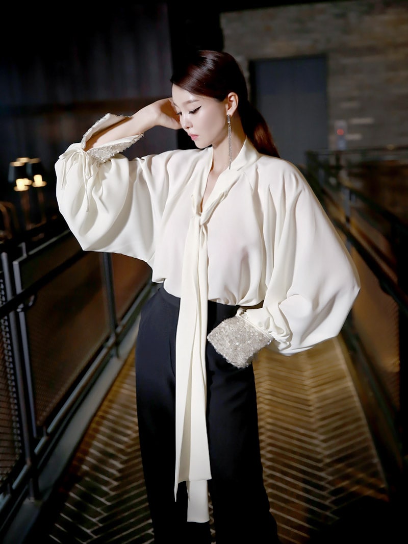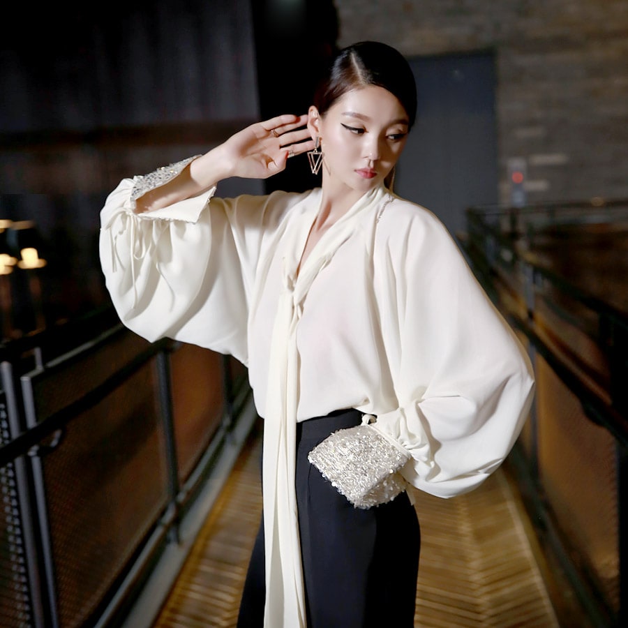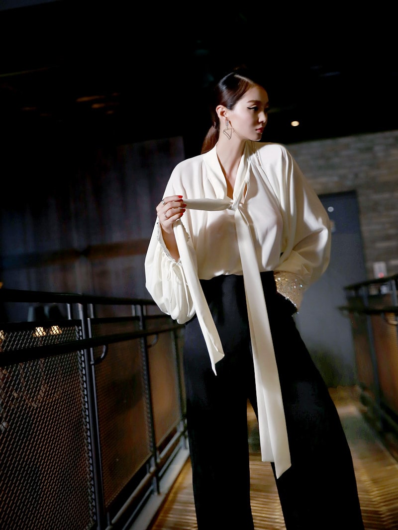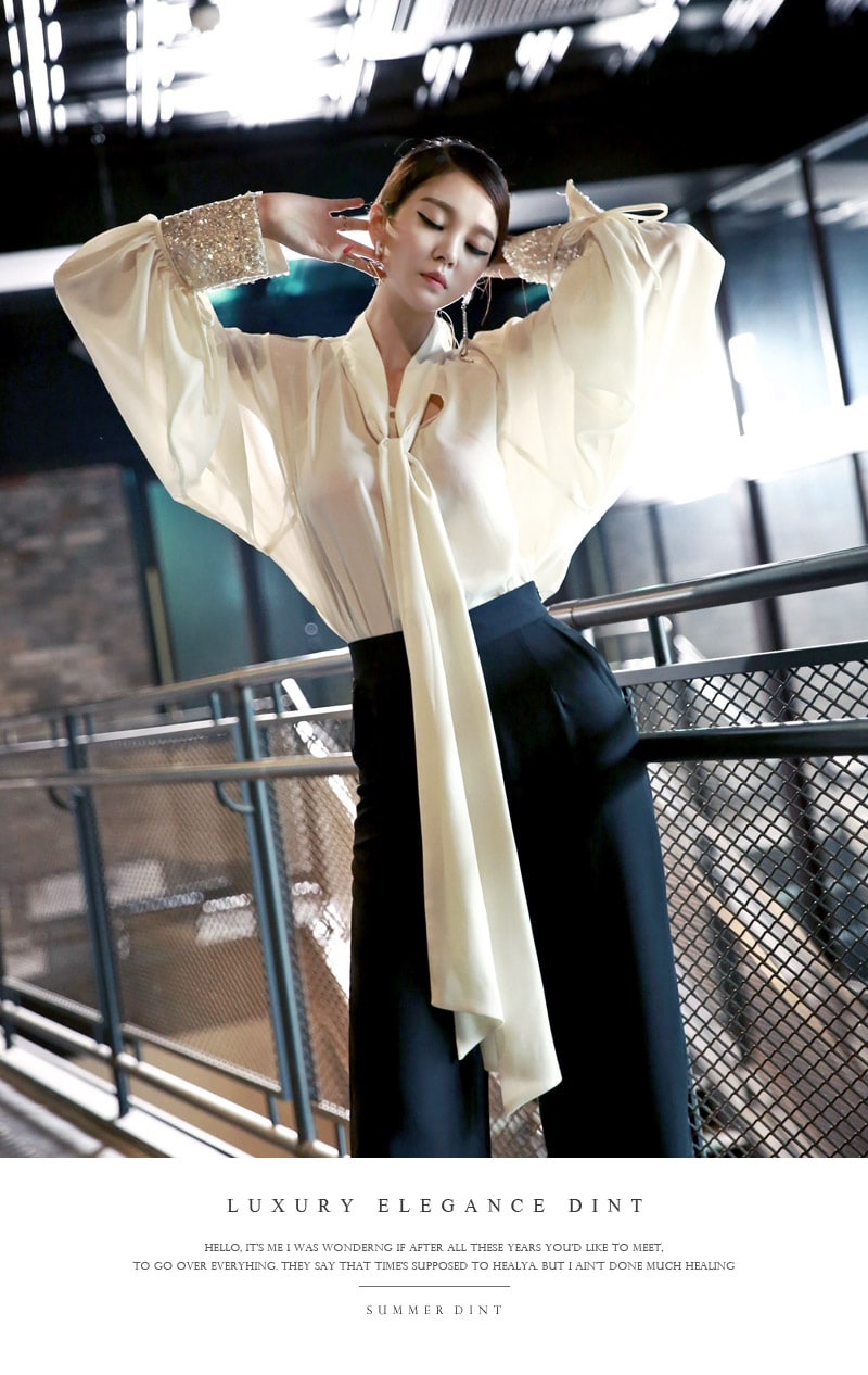 B1909 스팽글 커프스 루즈 블라우스 CreamP1735 스테이 사이드슬릿 쉬폰 슬랙스 BlackAJ-3526 이어링 SilverAJ-3179 링 SilverHAR-594 샤인 스트랩*HAND MADE* Gold