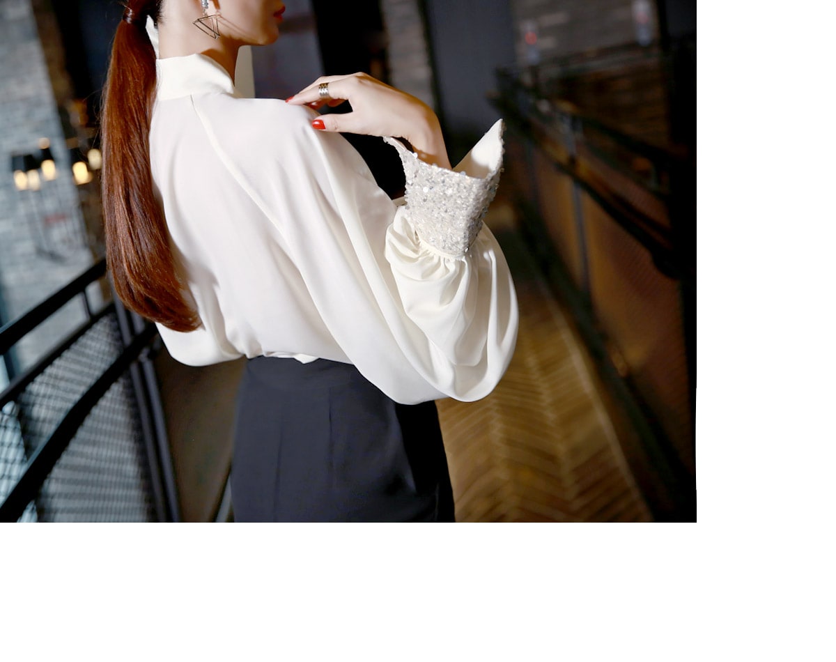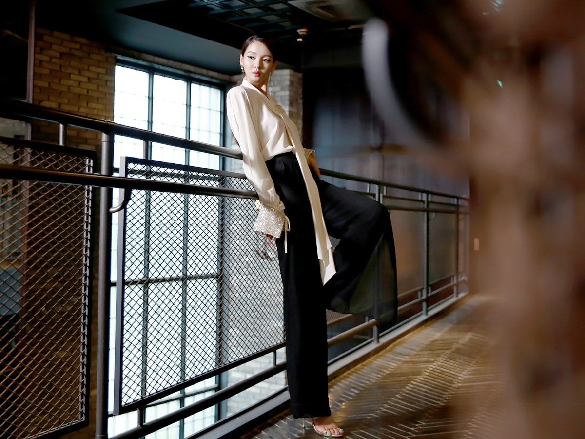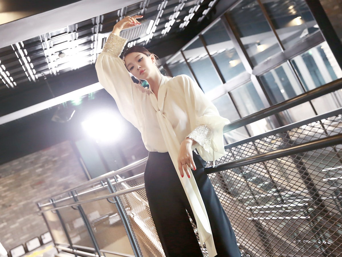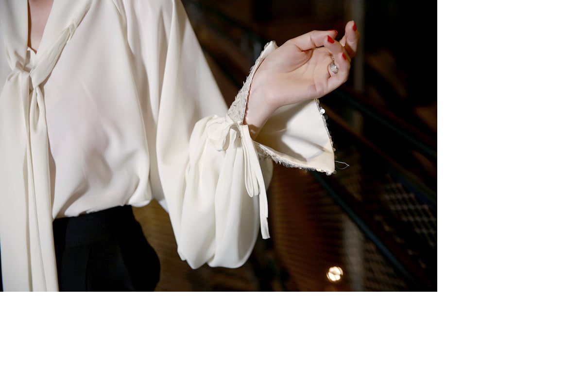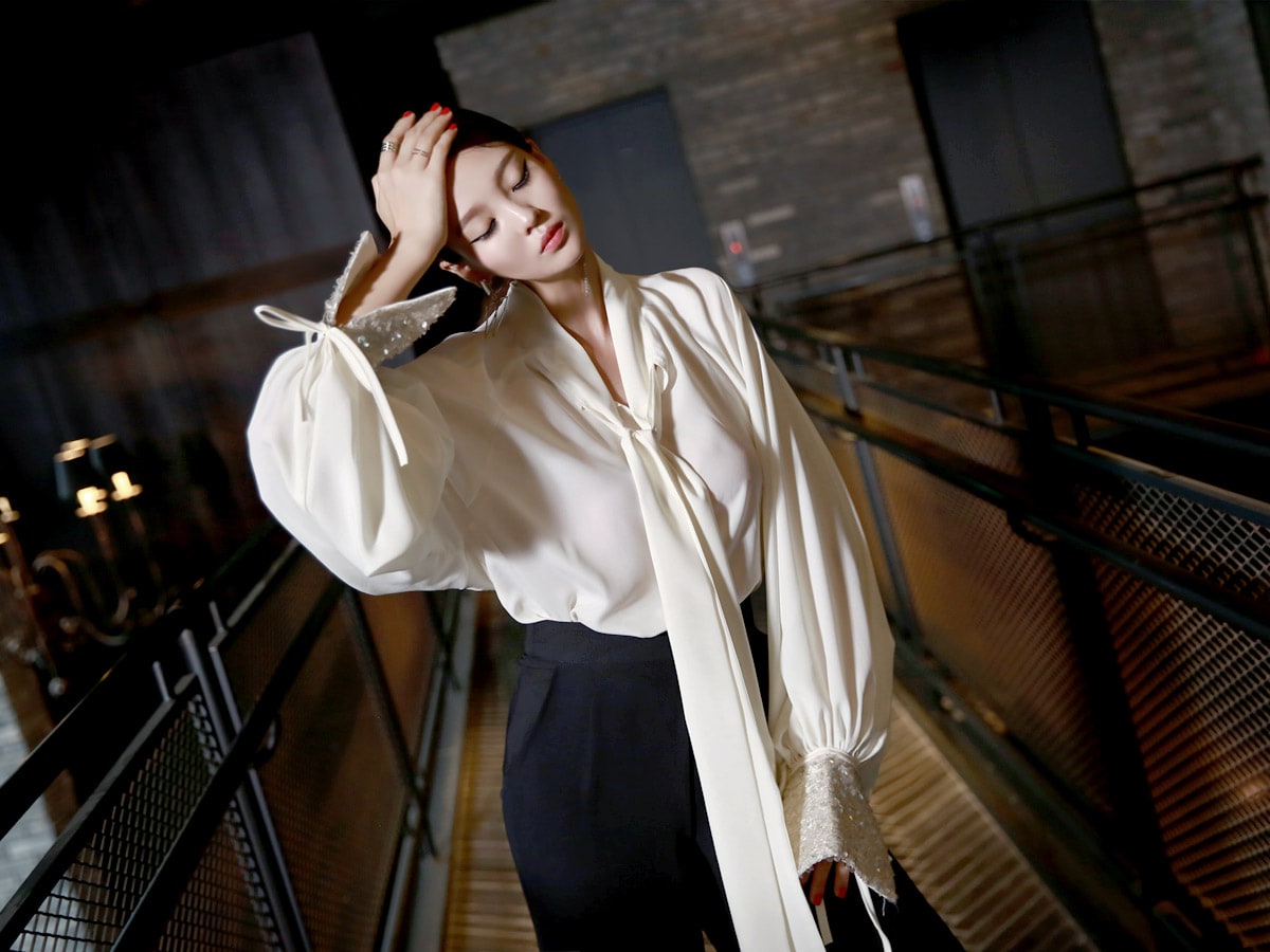 B1909 스팽글 커프스 루즈 블라우스 CreamP1735 스테이 사이드슬릿 쉬폰 슬랙스 BlackAJ-3526 이어링 SilverAJ-3179 링 SilverHAR-594 샤인 스트랩*HAND MADE* Gold