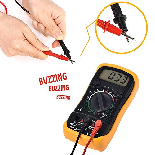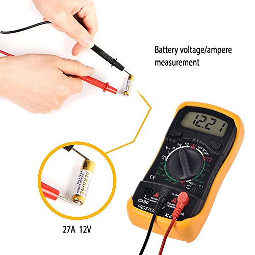 -. Feature : Der von CE festgesetzte Digital-Multimeter Überlastungsschutz---Sichere und präzisere Anwendung für Auto und Haushaltsgeräte / Großer LCD-Display mit Hintergrundbeleuchtung---Das Multimeter mit 1999 Zählung hat einen großen LCD-Display mit Hintergrundbeleuchtung, die notwendig für die Arbeit im Dunkel ist. / Umfassende Funktionen---Präzis Strom, Spannung, Widerstand und so weiter messen. Diode/ Transistor P-N-Übergang/ Trasisitor hFE testen. Größte Anzeige, Auto-Range und anhaltender Summer. / Gelbe Gummihülle als Stoßschutz und mit einer Halterung---Die Hülle aus Gummi ist rutschfest und dient als Stoßschutz. Der Halterung auf der Rückseite steht in einem Winkel von 45 Grad, damit man die Daten leichter lesen kann. / 9V Battereie und Messspitzen sind beinhaltet---Der Fachdeckel auf der Rückseite ist durch eine Kreuzschlitzschraube befestigt, nicht schwer zu entfernen. (Die Gummikappen für die Messspitzen sind nicht enthalten.)